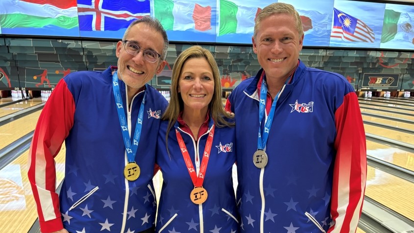 (From left to right) Senior Team USA bowlers John Janawicz, Jodi Woessner and Chris Barnes don their Masters medals, which they earned during Wednesday's final day of competition at the 2025 IBF World Seniors Championships in Reno, Nevada.