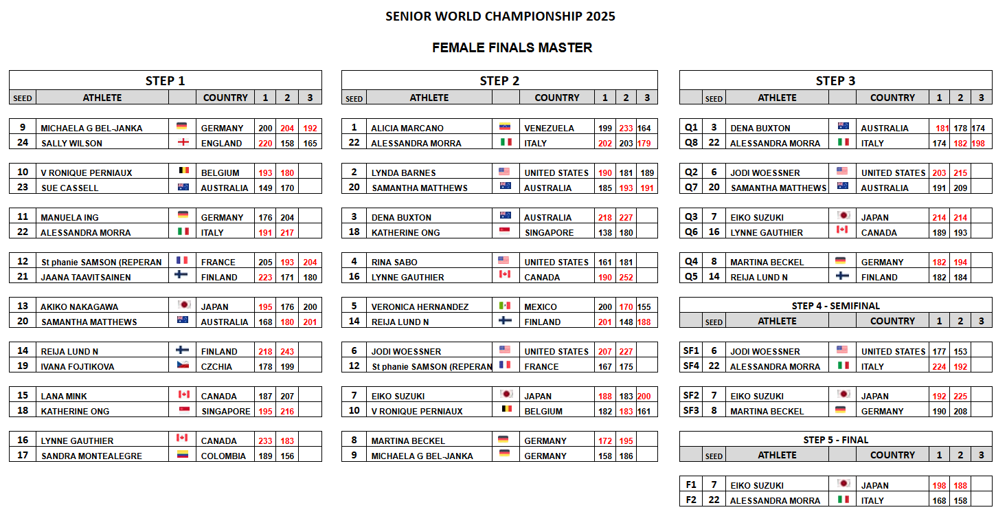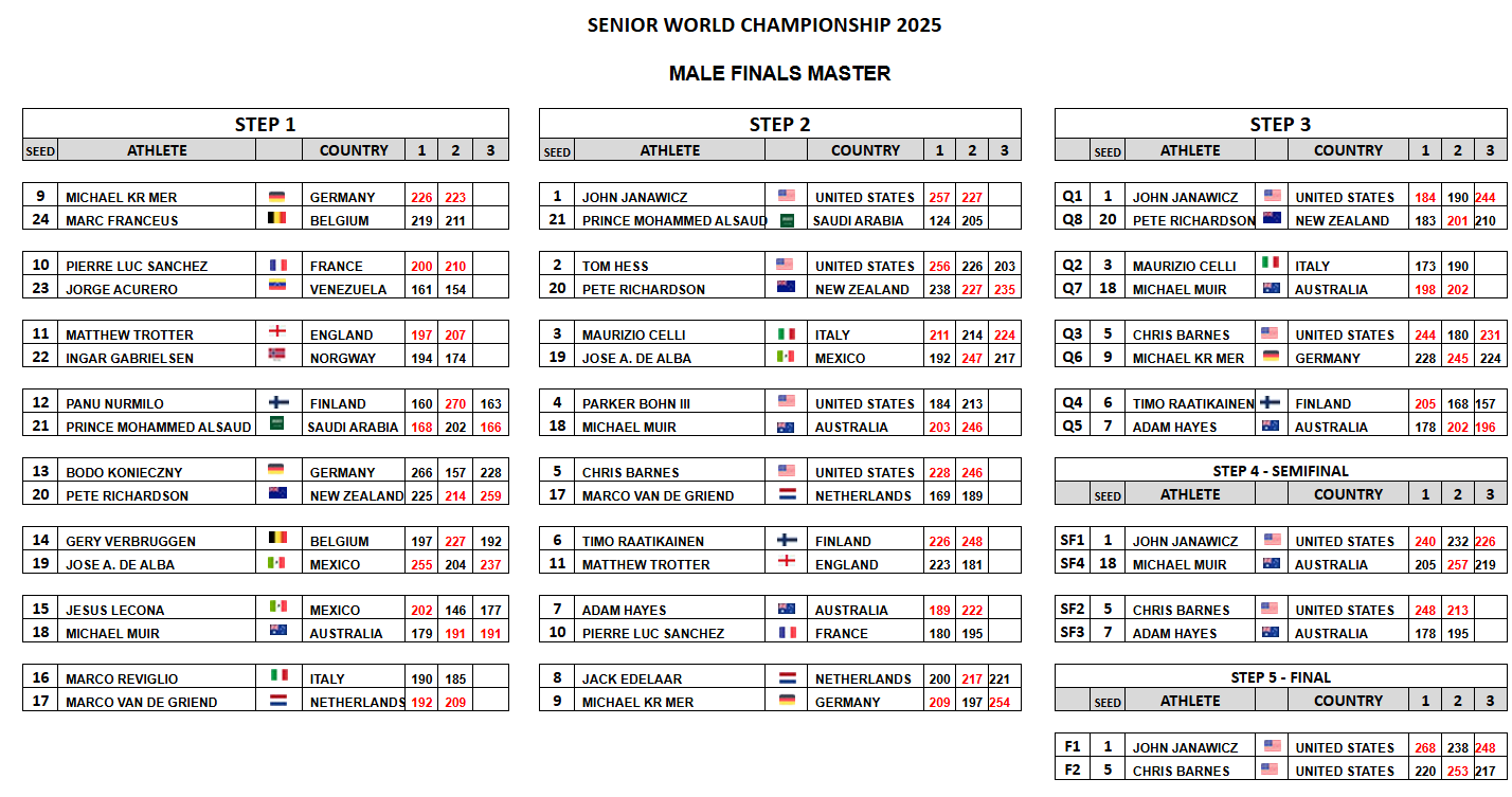 The American squad featured Chris Barnes of Denton, Texas; Parker Bohn III of Jackson, New Jersey; Tom Hess of Granger, Iowa; and John Janawicz of Winter Haven, Florida, on the men’s side while Dana Ausec of Colorado Springs, Colorado; Lynda Barnes of Denton, Texas; Rina Sabo of Bennett, Colorado; and Jodi Woessner of Oregon, Ohio, donned the red, white and blue for the Senior Team USA women.