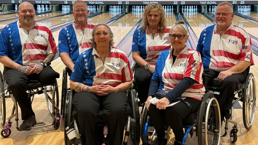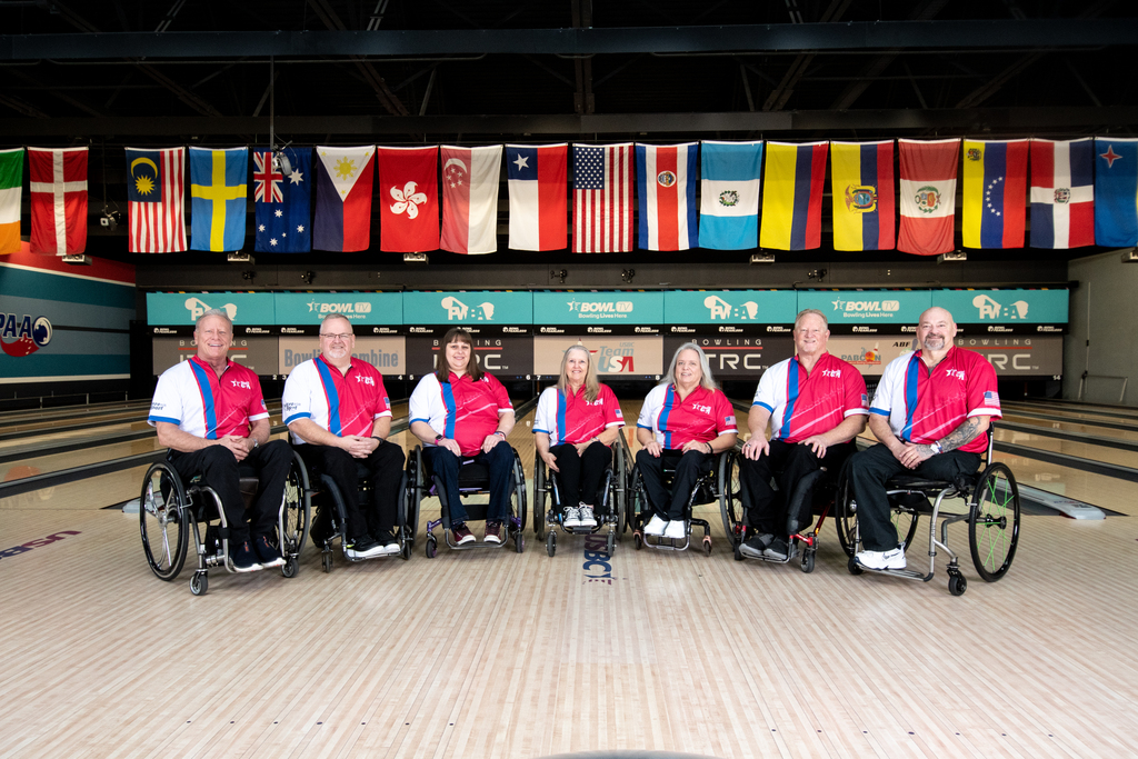 Para Bowling Team USA (from left): Mark Shepherd (2022-23 Para Team USA member), George Holscher, Jennifer Hooten (2022-23 Para Team USA member), Emma “Toodie” Perry, Stacy Sanders (2022-23 Para Team USA member), Eddy Hutchens and David Nelson Jr. (Not pictured - Debra Freed, Gina Jenkins)